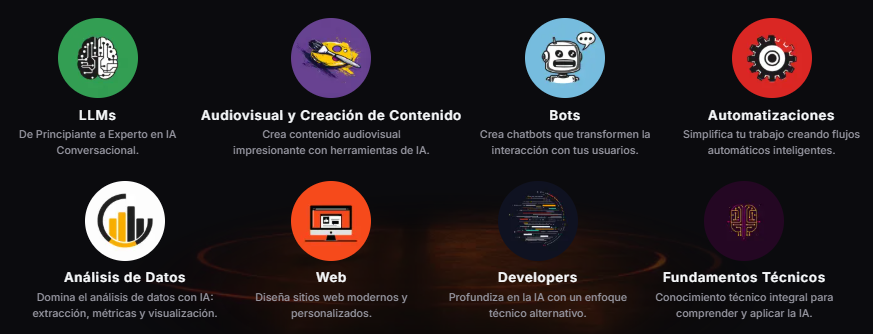 El enfoque de la escuela técnica va pensado para todo aquel que quiere aprender como funciona esta tecnología, sus algoritmos, dominar ChatGPT, crear asistentes personalizados, utilizar la IA en el marketing digital, automatizar tareas, crear bots para ventas, analizar competencias, y mucho más.