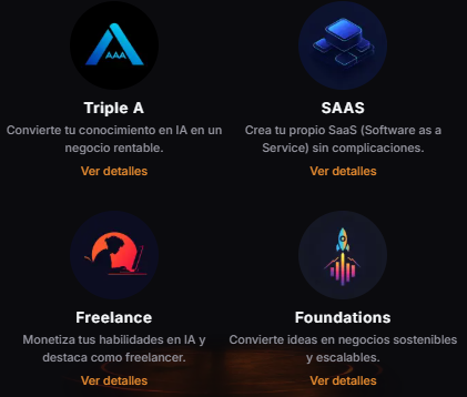 Está enfocado en implementar la IA sin necesidad de experiencia previa en programación, proporcionando formación util para que los usuarios puedan aplicar la tecnología y escalar sus negocios.